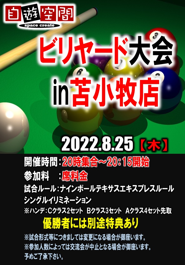 【申込方法】:当日集合時間にビリヤード場へご入場ください。