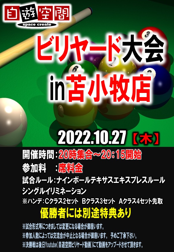 【申込方法】:当日集合時間にビリヤード場へご入場ください。