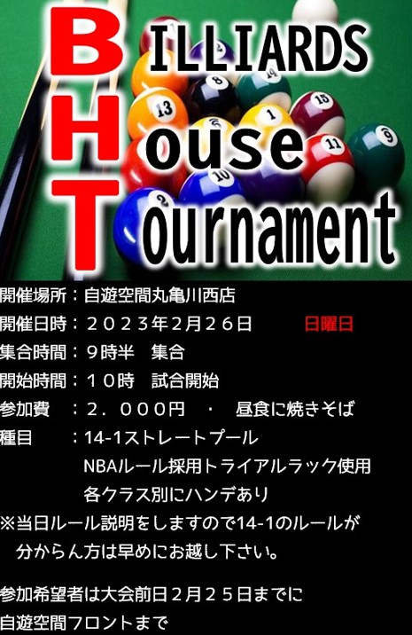 競技 14-1ストレートプールクラス別ハンデあり9時半集合10時スタートエントリー 2000円昼食に焼きそば提供当日ルール説明しますので早めにお越し下さい。参加希望のお客様は前日25日までにフロントまで。