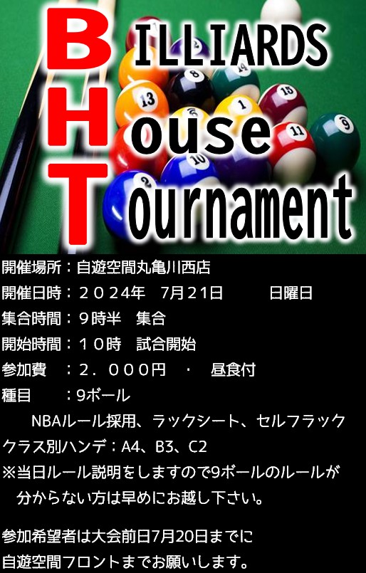 日時:2024年7月21日 日曜日時間:9時半集合 10時試合開始参加費:2000円 昼食付種目:9ボールハンデ戦 予選リーグ 決勝トーナメントハンデ:A4 B3 C2参加希望者は準備の都合上早めに自遊空間丸亀川西店フロント、グループLINEへ宜しくお願い致します。