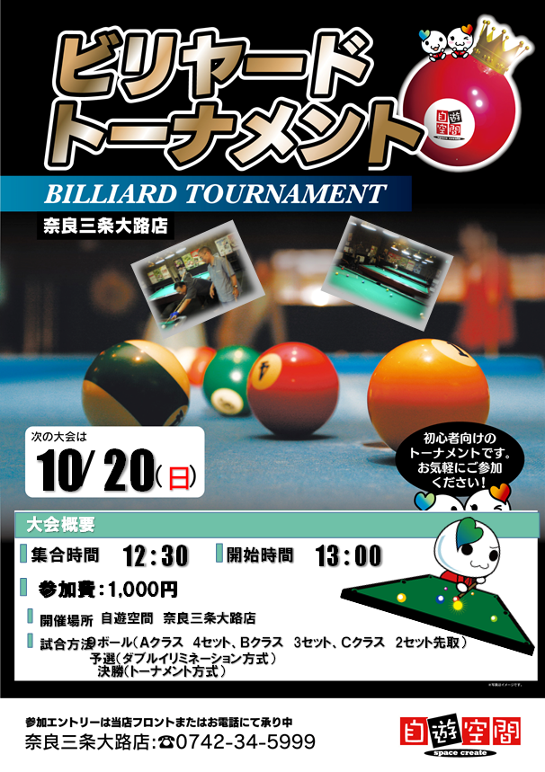 毎月開催のビリヤード大会です!【日時】12:00受付開始 13:00試合開始【試合形式】9ボールトーナメント
