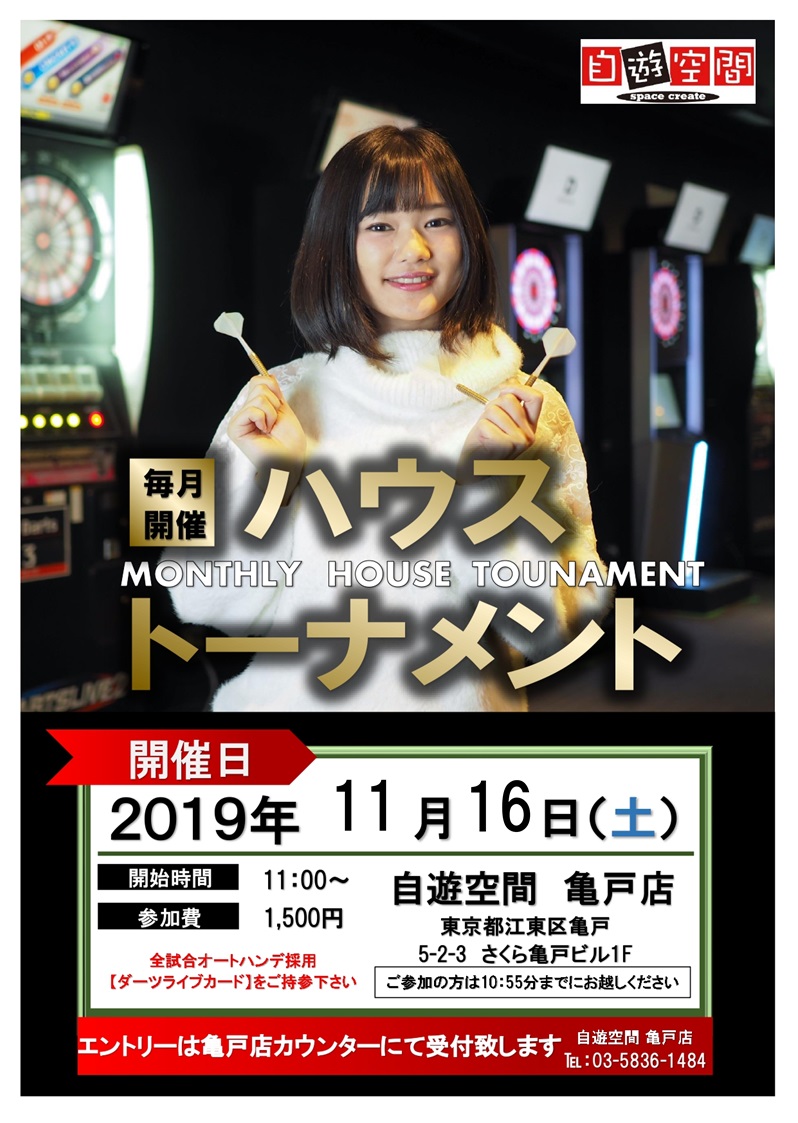 自遊空間亀戸店ダーツハウストーナメント 【毎月開催】 ■日時 10月19日(土)11:00~16:00 10:00 エントリー開始 11:00 試合開始 16:00 終了予定