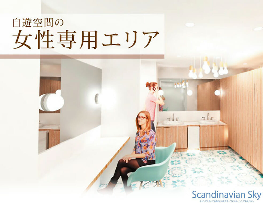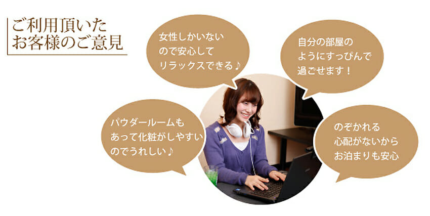 自遊空間では、女性のお客様のご要望にお応えして、女性の為のプライベート空間「女性専用エリア」をご用意。女性だけのプライベート空間には、専用のドリンクバー、専用のシャワールーム、専用のパウダールーム等をご用意。(店舗によって内容が異なります)「女性専用エリア」への入室には、入店時に手渡される専用カードキーが必要となるので、お一人様でも安心してご利用いただけます。女性専用エリアならではの充実設備