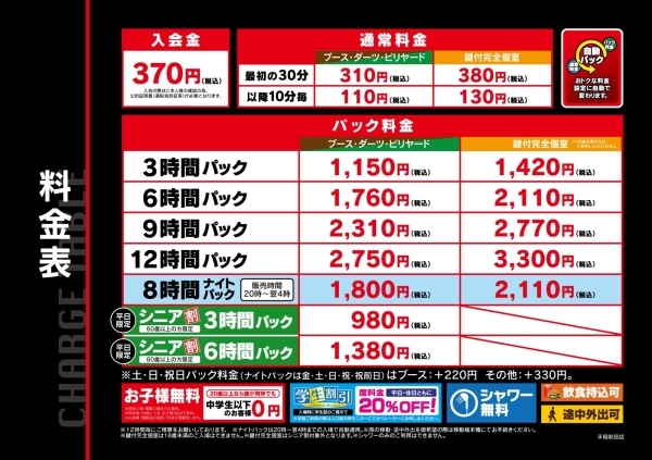〇ダーツビリヤードなどのグループ席につきましては、別々でご利用された場合は、対象外となりますので、お気をつけください。
