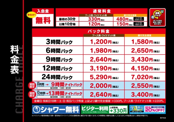 - カラープリンター / シャワールーム / ソフトクリームマシン / ペアマットブース / マットブース / リクライニングチェア / 喫煙所 / 完全個室あり / 禁煙席 / 自動パック切替